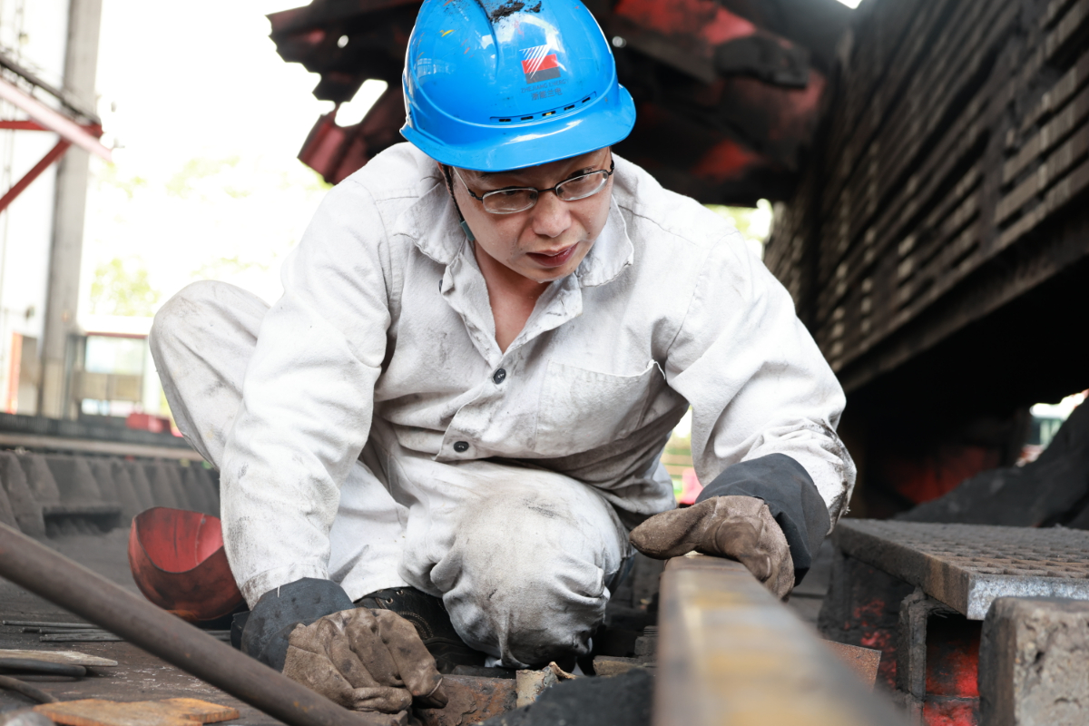 “撬棍再壓下來點,再加一塊墊片試試?!痹谔m溪發(fā)電公司翻車機(jī)房,陣陣熱浪撲面而來,身著白色焊工服的褚建華剛到現(xiàn)場便急著俯身趴在翻車機(jī)活動軌道上反復(fù)查看,不一會身上、帽子上便蹭上了許多煤粉,臉上的汗水“嗒嗒”地滴落在滾燙的鐵軌上迅速蒸發(fā),他的眼睛卻只是直直地盯著軌道,不停地對軌道高度做著調(diào)整,拆解螺栓、撬動軌道、電焊加固……一套操作下來,他已俯身在地一個多小時了,終于趕在煤車翻卸前完成了任務(wù)。他說,“熱點、累點都在其次,外面煤車這么多,我們可不能掉鏈子。在關(guān)鍵時期,設(shè)備安穩(wěn)了,我們心里才踏實?!?/span>