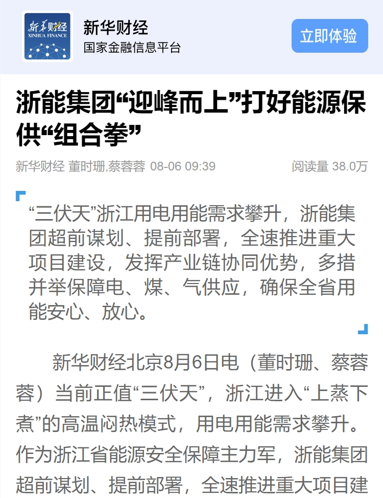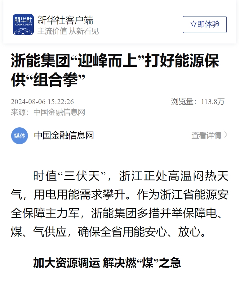 新華社客戶端、新華財經(jīng)客戶端報道《打好迎峰度夏“組合拳” 浙能集團持續(xù)提升能源保供能力》。