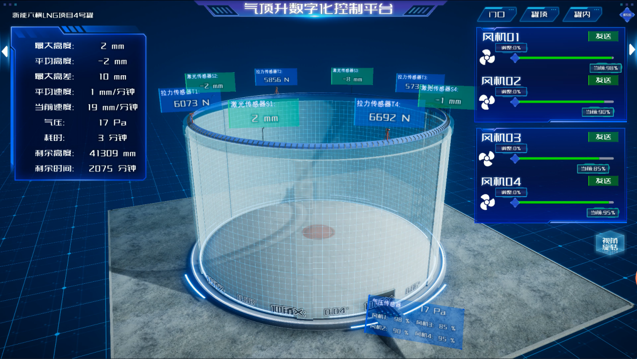 浙能六橫LNG項目共建4座儲罐,每座儲罐穹頂重達千噸,氣頂升上升高度相當于“爬”上14層樓。為確保穹頂升起均衡平穩,項目使用了數智化頂升系統,通過密布罐體的傳感器實時監控頂升數據,結合三維可視化智控,大幅減少了人工操作帶來的誤差,讓氣頂升的過程變得精準、智能、安全。
