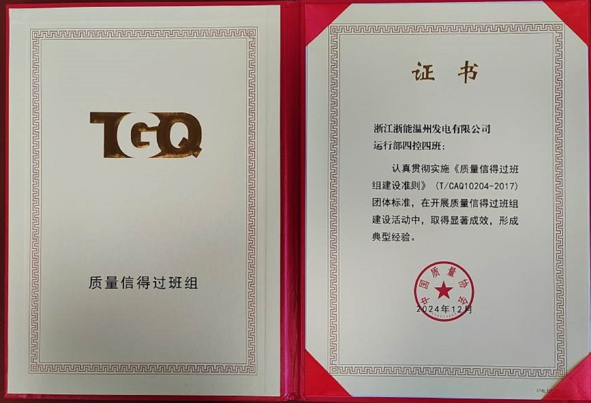 溫州發(fā)電公司運(yùn)行部四控四班“全國(guó)質(zhì)量信得過(guò)班組”榮譽(yù)證書。 王儷穎 攝