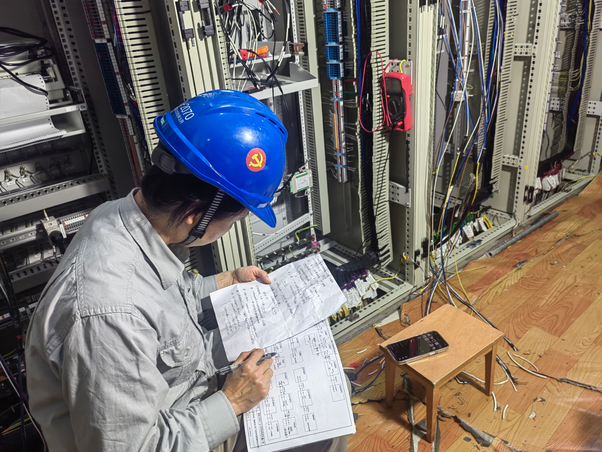 電子室是迎峰度夏的另一個(gè)戰(zhàn)場。從端子到圖紙,電氣女將陳涌君的手就是連接兩者的橋梁。她將復(fù)雜的電氣線路化為一條條整齊羅列的線索,密密麻麻的圖紙記滿了檢查的要點(diǎn),指尖的繭記錄著她分毫析厘的專注。對她來說,經(jīng)手的每一個(gè)數(shù)據(jù)都是維系安全的重要密碼,一個(gè)都不能出錯(cuò)。