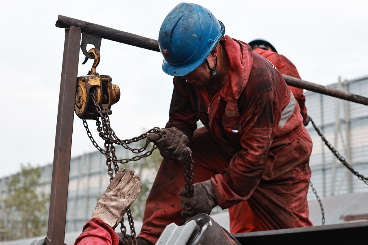 浙能港口公司檢修員在使用手拉葫蘆輔助作業(yè)。 陳宇 攝