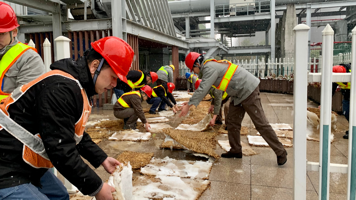 12月18日下午,浙能長興發(fā)電公司燃機項目部黨員志愿者冒著風(fēng)雪在廠區(qū)主干道鋪設(shè)防滑草墊,保障生產(chǎn)安全。 位亞飛 攝