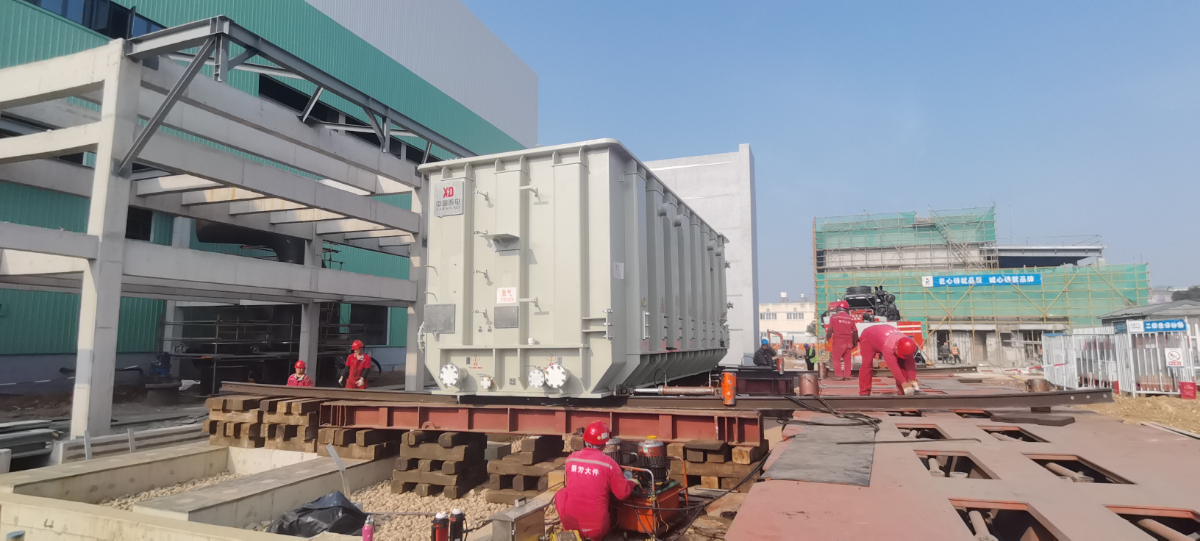 鎮(zhèn)聯(lián)電燃機異地遷建改造項目施工人員正進行主變設(shè)備安裝。 王向陽 攝