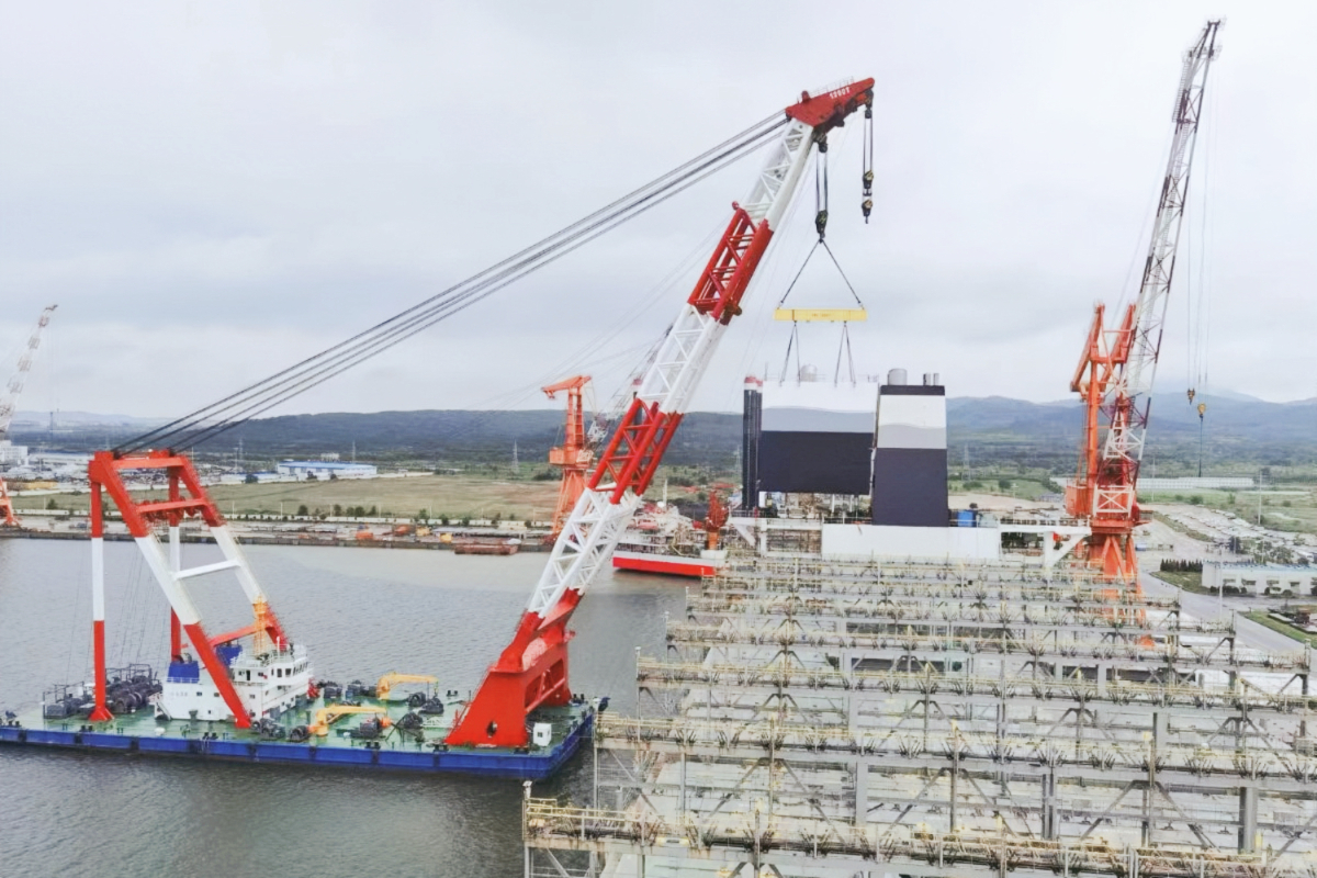 在大連長興島,浙能邁領(lǐng)公司首次使用大型浮吊來吊裝塔房分段。 劉顯亮 攝