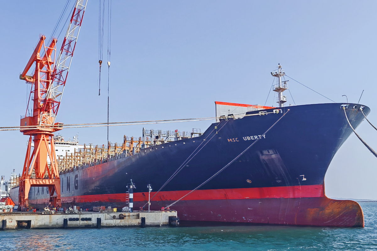 在大連船廠,浙能邁領(lǐng)公司完成脫硫改造的MSC UBERTY開始試航。 李夢 提供