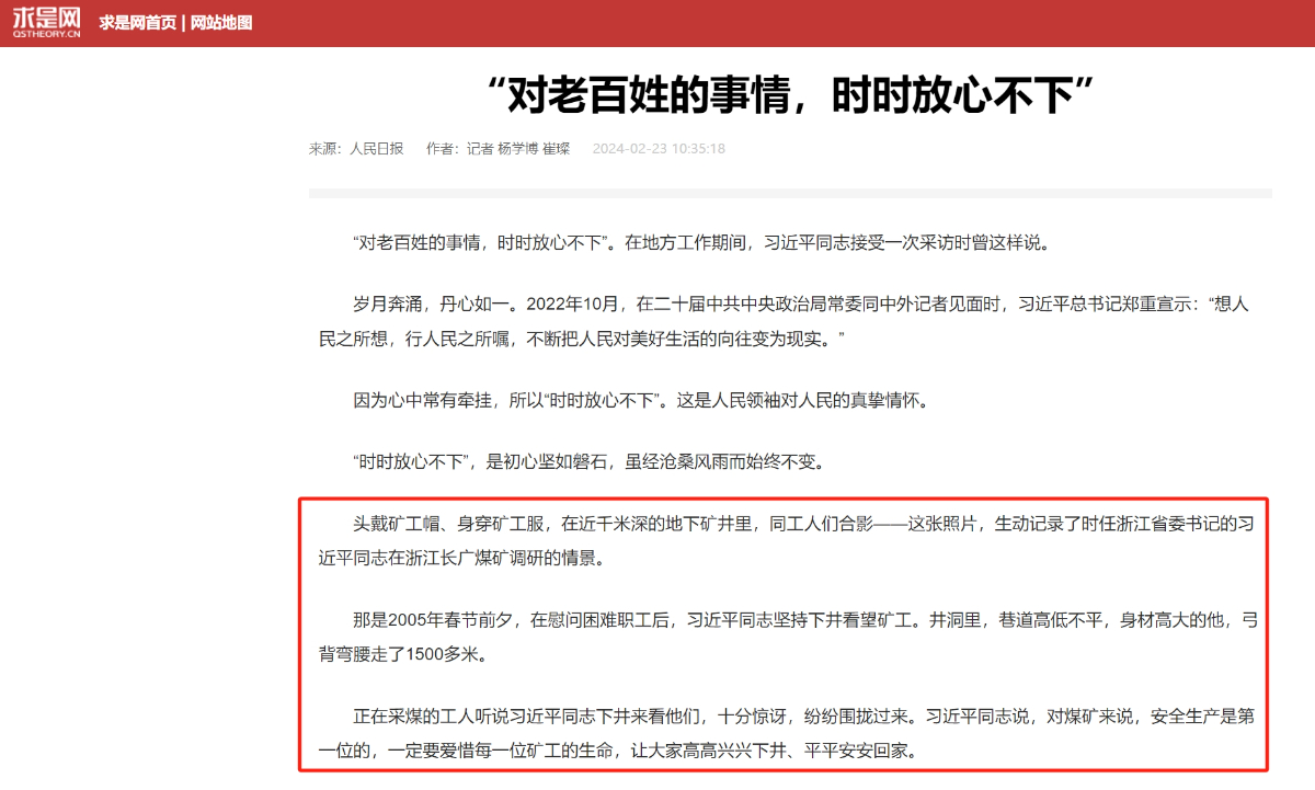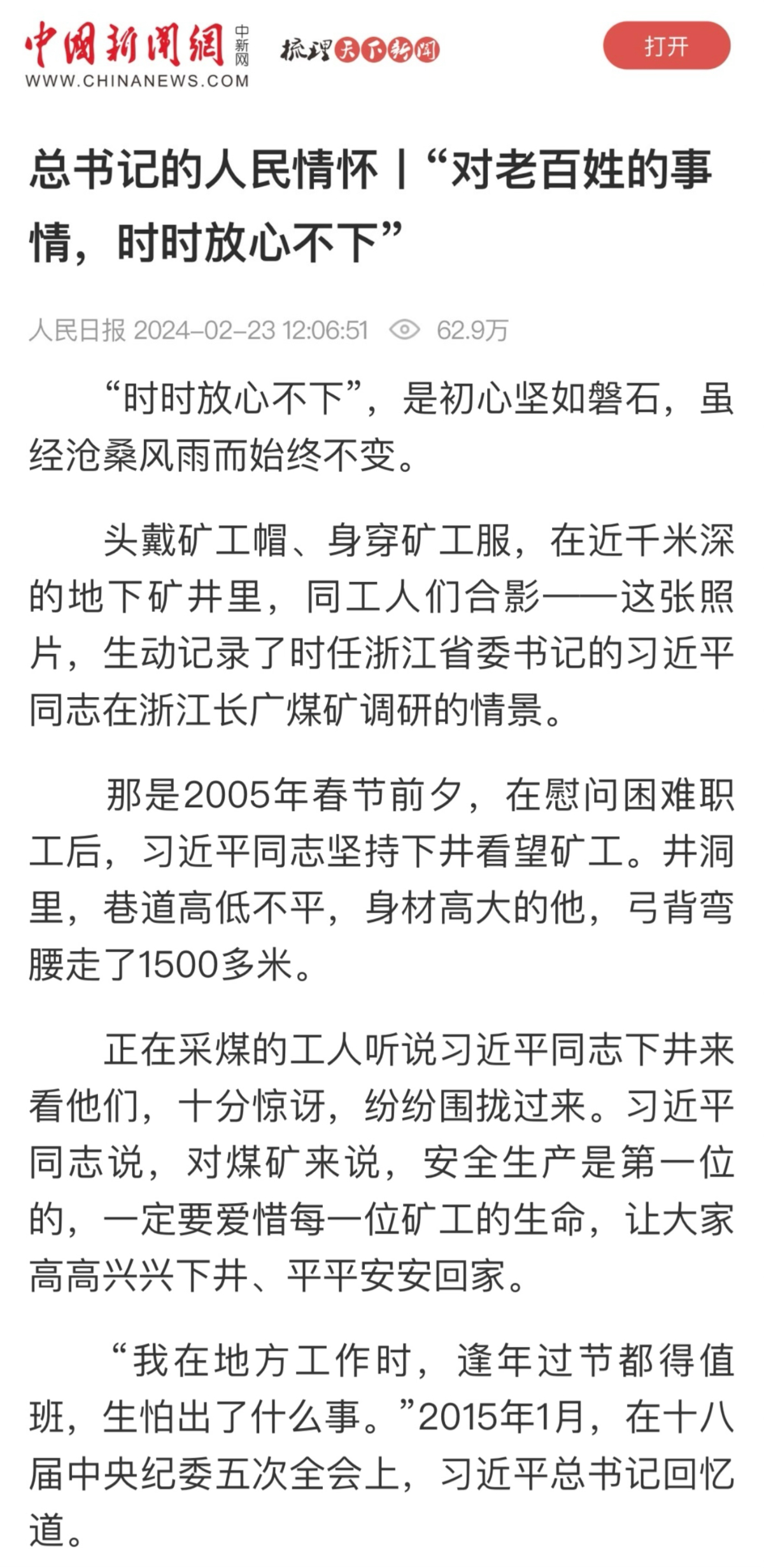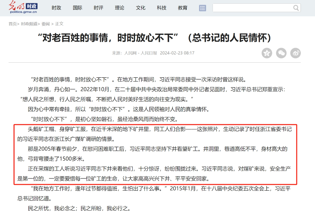 本網(wǎng)訊 2月23日,《人民日報》頭版頭條刊登《總書記的人民情懷|“對老百姓的事情,時時放心不下”》,光明網(wǎng)、求是網(wǎng)、中國新聞網(wǎng)、中國日報中文網(wǎng)、中國經(jīng)濟(jì)網(wǎng)等多家央媒頭版轉(zhuǎn)載。“以時時放心不下的責(zé)任感、積極擔(dān)當(dāng)作為的精氣神為黨和人民履好職、盡好責(zé)”,這是習(xí)近平總書記對廣大黨員、干部的殷切囑托,也是一個百年大黨走好新的趕考之路的底氣所在。 文中記錄了習(xí)近平總書記的調(diào)研故事,其中第一個講述的就是時任浙江省委書記習(xí)近平同志到長廣煤礦調(diào)研的故事。