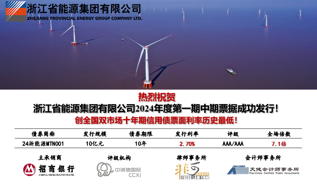 3月6日,浙能集團成功公開發(fā)行10億元十年期中期票據(jù),票面利率2.70%。這是浙能集團2024年在銀行間市場發(fā)行的首單十年期債券產(chǎn)品,創(chuàng)全國銀行間和交易所雙市場十年期信用債發(fā)行利率歷史最低。