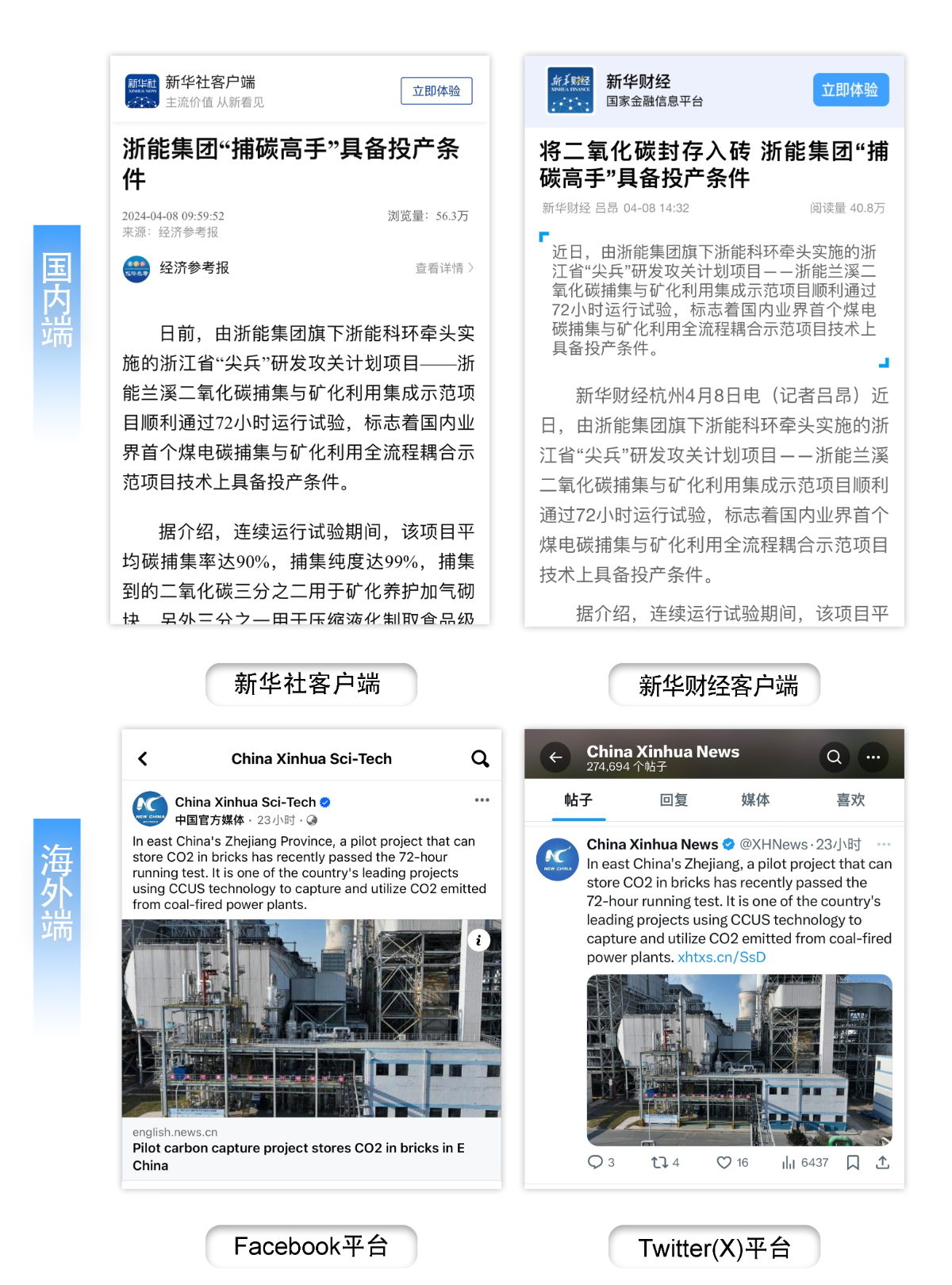4月8日-4月9日,新華社客戶端、新華財經客戶端及新華社facebook、Twitter(X)等社交媒體官方賬號報道《浙能集團“捕碳高手”具備投產條件》。 新華社 圖