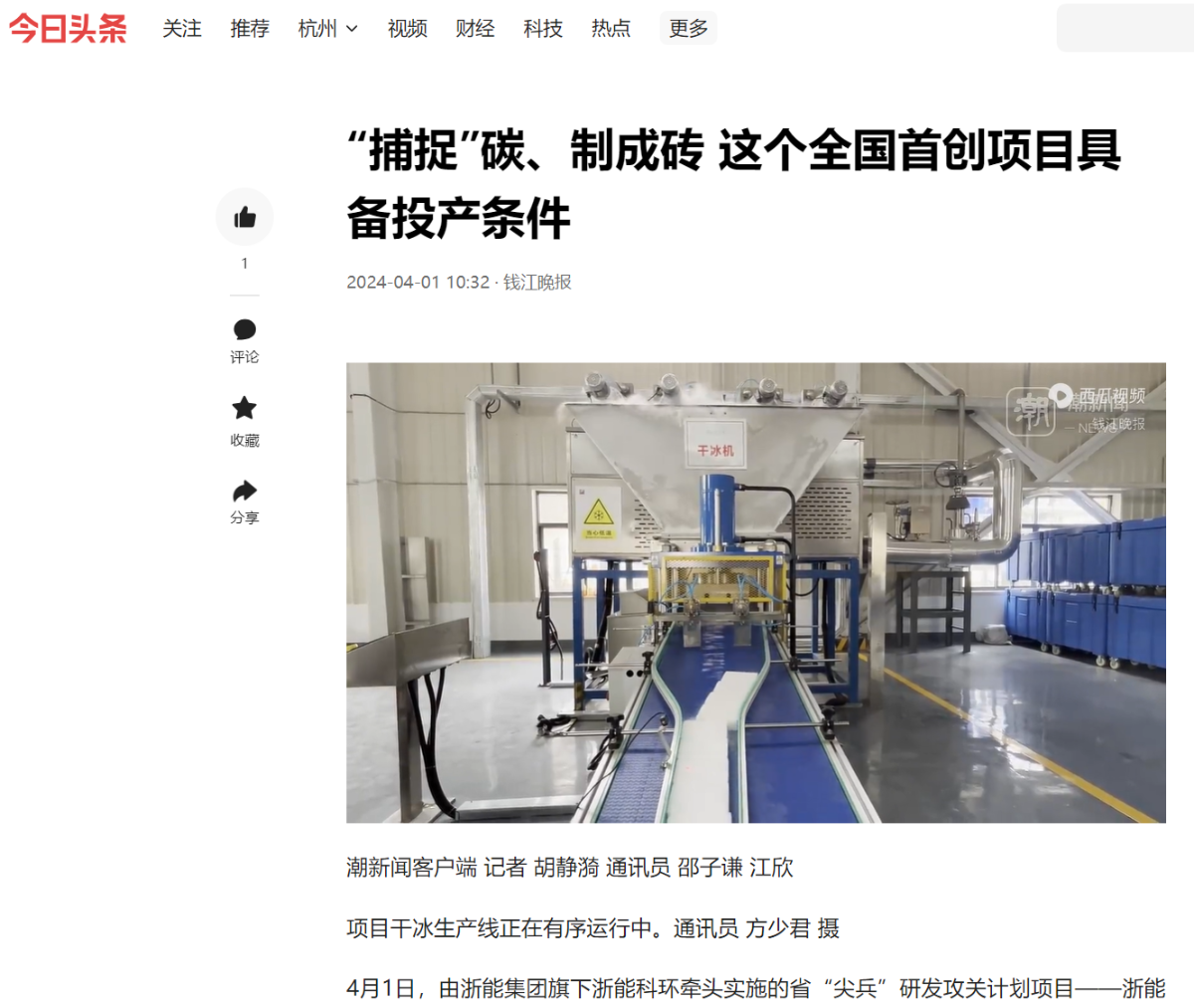 4月1日,今日頭條轉載報道《“捕捉”碳、制成磚 這個全國首創項目具備投產條件》。 今日頭條 圖