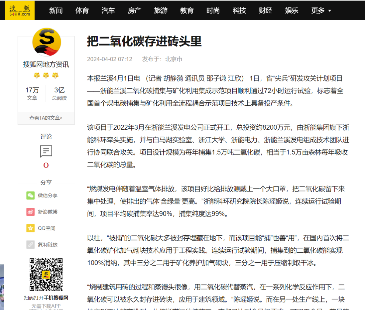 4月1日,錢江晚報搜狐號轉載報道《“捕捉”碳、制成磚 這個全國首創項目具備投產條件》。 錢江晚報搜狐號 圖