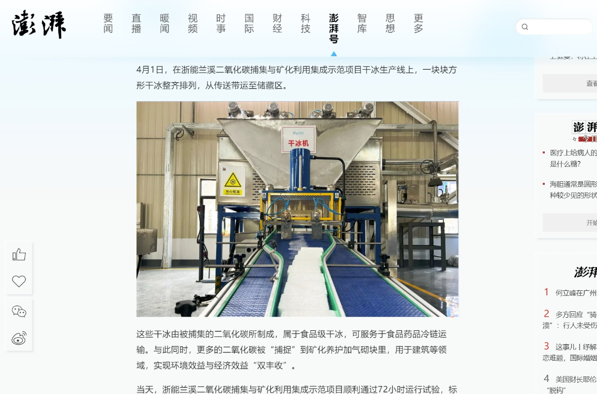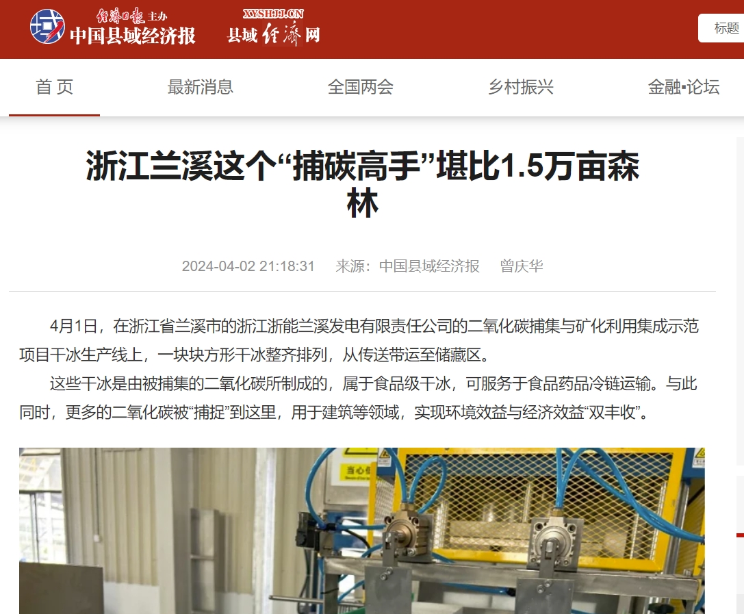 4月1日,蘭溪新聞網報道《蘭溪這個“捕碳高手”堪比1.5萬畝森林:每年捕集1.5萬噸二氧化碳且100%消納利用》。 蘭溪新聞網 圖