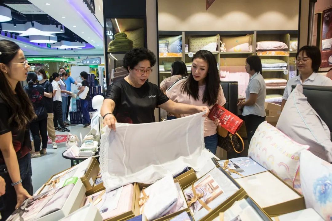 “滿4999贈云南6日雙人游”“正價品買多少送多少” ……在孚日家紡高密旗艦店,新國潮、新輕奢、新都市、新田園等各種風格的床上用品前擠滿了爭相選購的顧客,毛巾、浴巾、浴袍、家居服等各種款式的家用紡織品也被眼光精準的顧客“圍獵”。