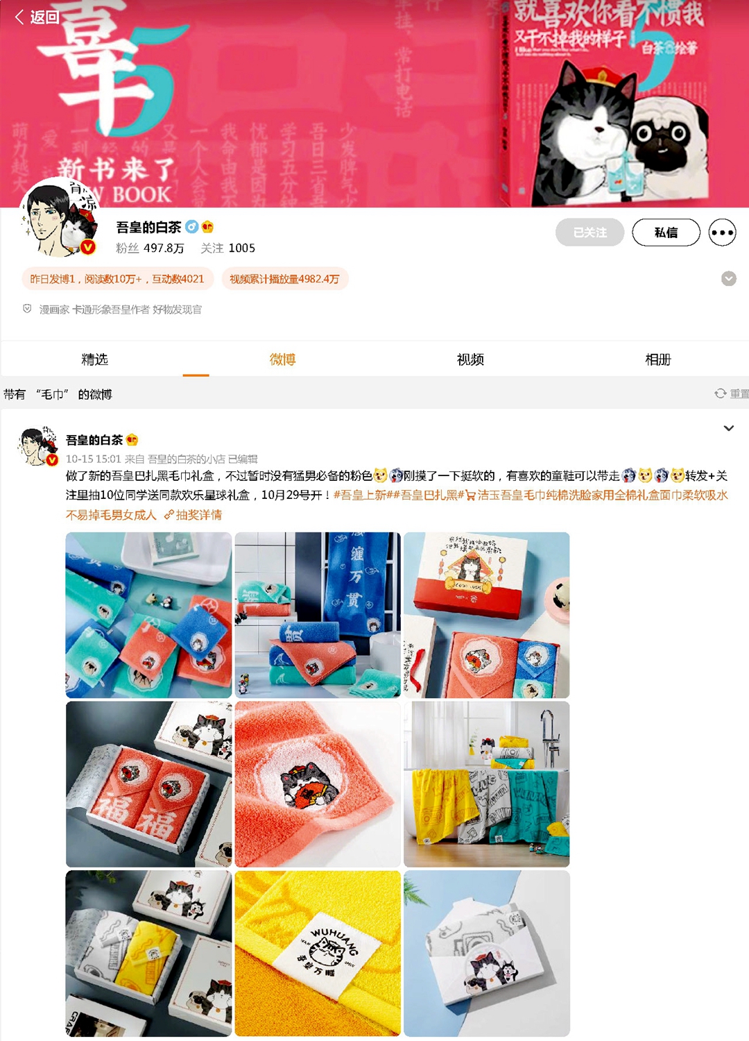 2021年10月15日,漫畫家、卡通形象吾皇作者“吾皇的白茶”發(fā)布微博,稱“做了新的吾皇巴扎黑毛巾禮盒,不過暫時沒有猛男必備的粉色,剛摸了一下挺軟的,有喜歡的童鞋可以帶走”,配圖赫然正是孚日集團(tuán)攜手“吾皇萬睡”新推出的傲嬌巾品。
